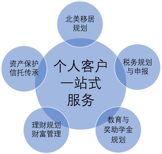 - 面向个人客户,提供的服务包括北美留学移居一体规划,跨国财税规划、个人退休计划、投资管理,信托传承等方面。为客户量身定制国际身份、教育、财税等收益最大化的全局早规划和一揽子解决方案,确保客户和家人顺利登录北美开启新生活。